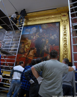... jak każda telewizja.Bo jak wiadomo od czasów komuny Telewizja Kłamie !!! Dzisiaj może inaczej ale jednak. Składając ramy i montując Hołd Pruski ekipa techniczna i konserwatorska była tak zestresowana że zgodziła się postawić na próbę Hołd przy ramach abyśmy mogli napisać że wreszcie jest. I także się stało. My się wynieśliśmy a oni już spokojnie mogli pracować. Oczywiście zaprosili nas na dzień następny na odbiór konserwatorski. I jak się okazało następnego dnia rama była dalej nie zsunięta i miałem możliwość sfotografowania tego ostatniego momentu. Dzisiaj kiedy w Sukiennicach trwa impreza " Powitaj Hołd Pruski " mogę już pokazać te zdjęcia. A pokazuję je w ramach " Hołdu mojego prywatnego " wobec całej ekipy technicznej i konserwatorskiej dla której pracy mam wiele szacunku.