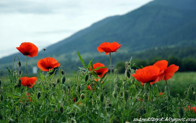.... czerwone ale nie pod Monte Casino tylko w moich ukochanych Beskidach. Dopadająca mnie choroba zwana Pierdolec ( z lac. EURO 2012 ) spowodowała mój nagły wyjazd w góry. Choroba oczywiście nie przeszła, pierdolec jak we mnie siedział tak siedzi ( moi w Agencji nie dają odżyć ) ale za to trafiłem na coś co coraz rzadziej w Polsce można spotkać a w Europie w ogóle. Polne maki czyli (Papaver rhoeas L.)z rodziny (Papaveraceae Juss.) W Polsce jest archeofitem czyli rośliną obcego pochodzenia. To pole maków wyrosło na nieużytku. I może dlatego maki są widokiem nieczęstym. Mimo że choroba nie przeszła, to widok czerwonego pola był przepiękny... Nie było tylko Szapołowskiej żeby wypowiedziała kwestię ... Cała jestem w maku...