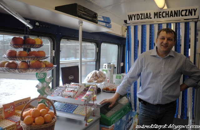 ... czyli Tramwaj pożądany na Kampusie Politechniki Krakowskiej. Stał tam od ponad roku. Walka tez trwała od roku. Walka o otwarcie w zabytkowym tramwaju GT 6 ... kawiarni. Trzeba było przejść wiele, i wiele przepisów dostosować do tramwaju i tramwaj do przepisów. Ale jak ktoś się uprze to zrobi. A Politechnika się uparła. Wczoraj w Tramwaju GT 6 stojącym przed Wydziałem Mechanicznym w Kampusie Politechniki Krakowskiej otwarto uroczyście Pantograf Cafe czyli kawiarnię nie tylko dla studentów. Były ciastka, kawa i lunch złożony z kanapek. Było dużo dziennikarzy i nie było studentów ( na godzinę otwarcia zamknięto kawiarnię bo wszyscy by się nie pomieścili ) ale już widać było po stojących na zewnątrz że Pantograf Cafe wzięcie będzie miało na pewno. Jak ktoś będzie w pobliżu PK , w Parku Lotników czy też będzie szedł do Muzeum Lotnictwa warto te 50 metrów " zboczyć " i wstąpić do kawiarni. warto choćby na bardzo dobra kawę !!!