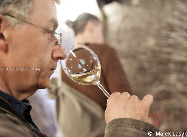 Ale na razie jesteśmy w Komorze Haluszki i degustujemy. Gospodarze zdecydowali się otworzyć trzy flaszki. Chardonnay, Merlot oraz Riesling. Ten ostatni to wino zrobione z częściowo zbotrytyzowanych gron czyli takich przemrożonych zbieranych jako niezwykle przejrzałe których cechą jest wysoka ilość cukru.